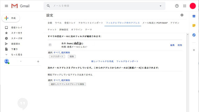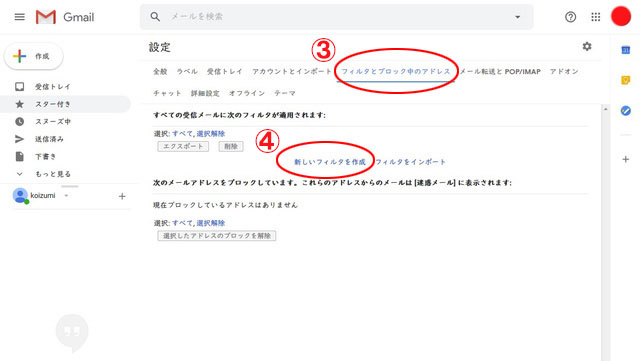 - 3.設定メニューの「フィルタとブロック中のアドレス」へ移動し「新しいフィルタを作成」をクリックします