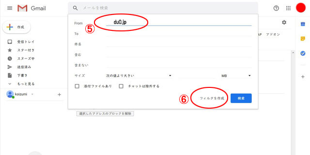 - 4.From欄に「pairry.jp」と入力し、「フィルタを作成」をクリックします