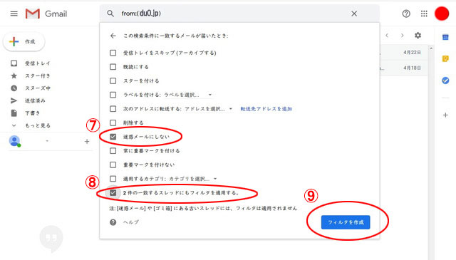 - 5.「迷惑メールにしない」と「○件の一致するスレッドにもフィルタを適用する」のボックスにチェックを入れ、「フィルタを作成」をクリックします