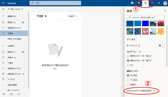 - 2.右上の「歯車マーク」からメニューを開き「Outlookのすべての設定を表示」をクリックすると設定メニューが開きます