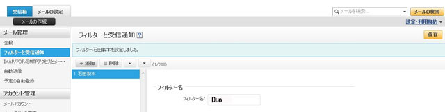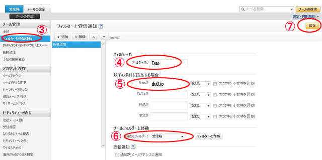 フィルター名に適当な名称を入れ、From欄に「pairry.jp」を入力し、移動先フォルダーに「受信箱」を指定します。 指定が終わったらページ右上の「保存」ボタンをクリックします。